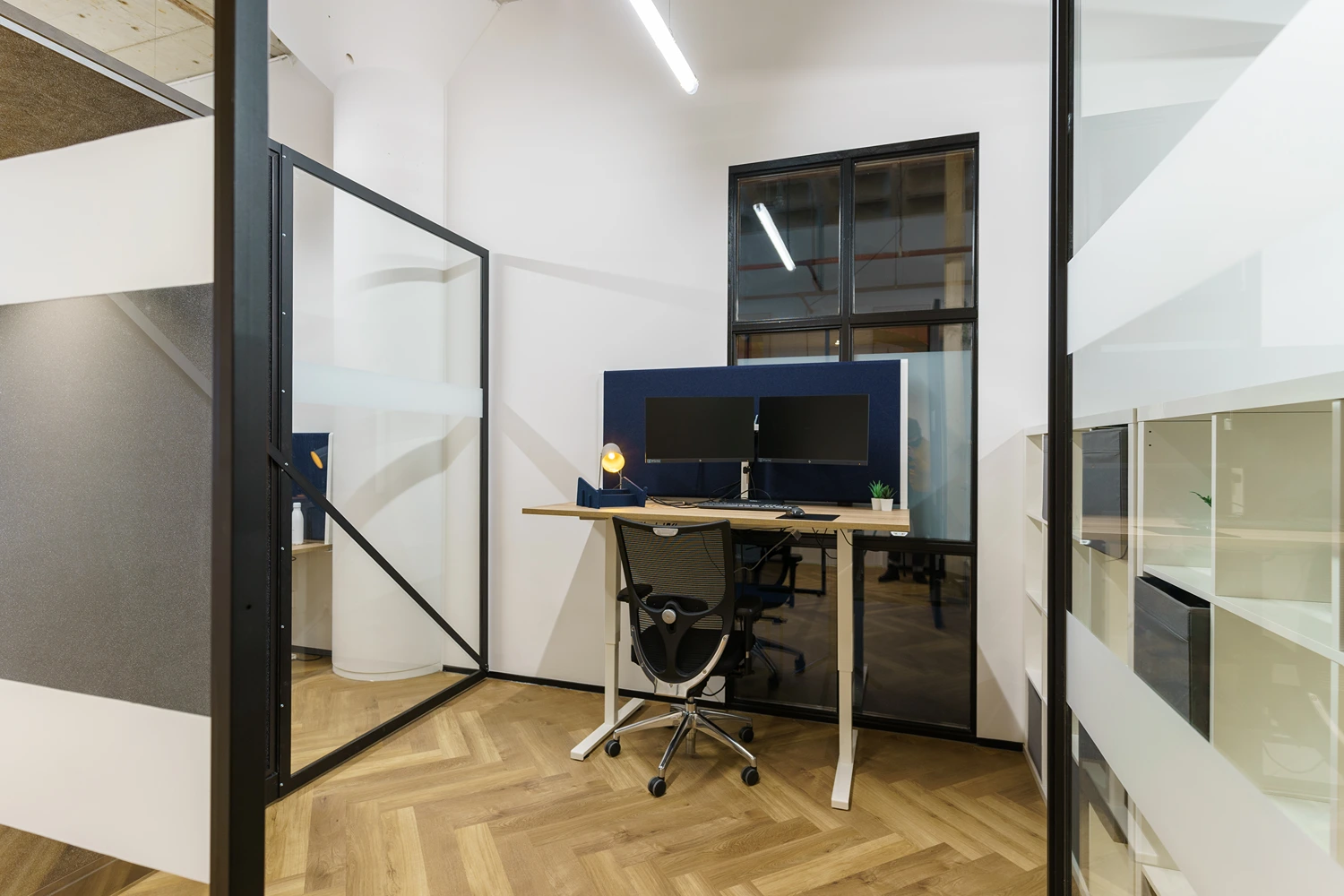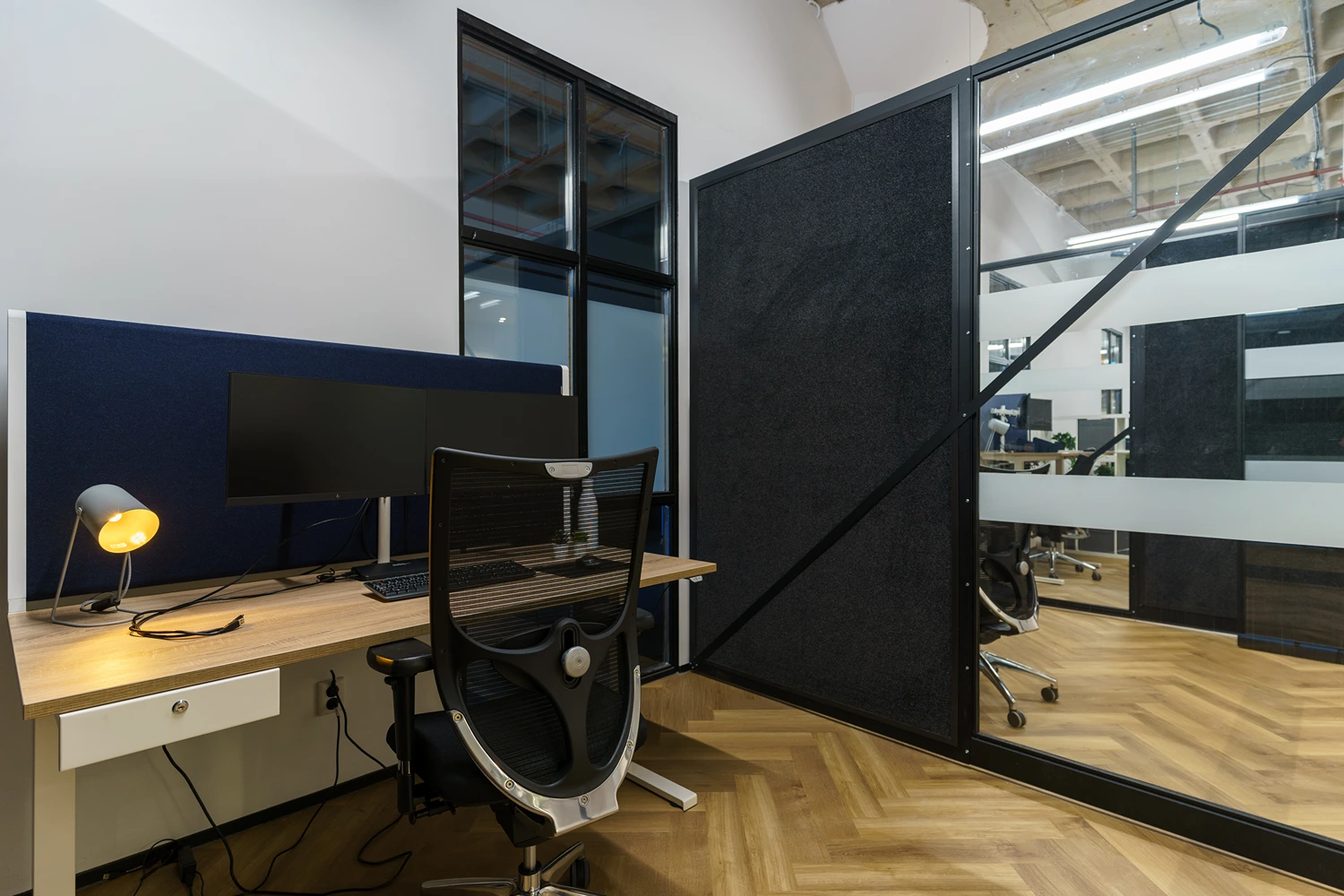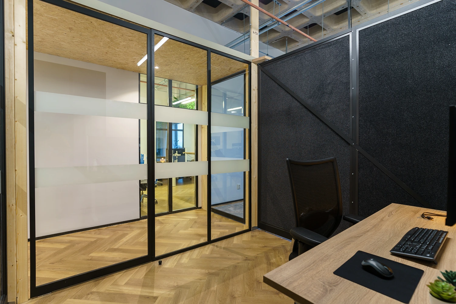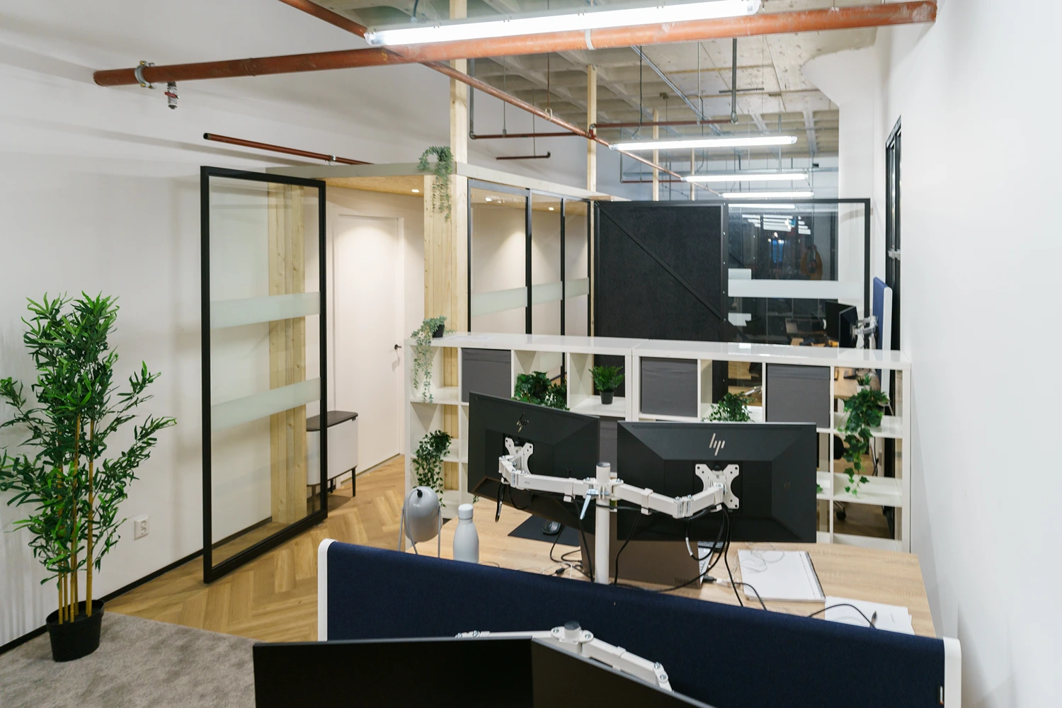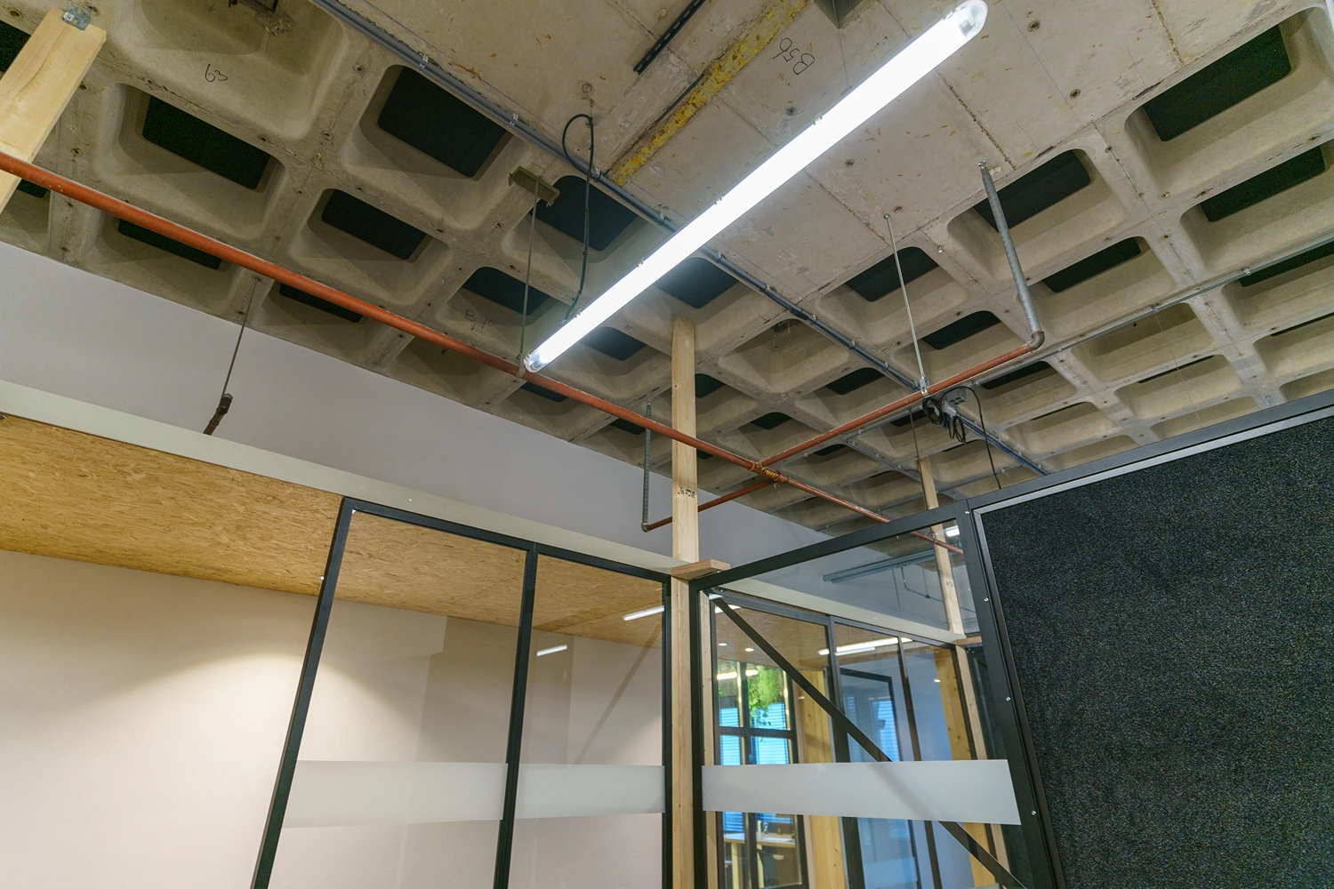 - Afwerking: Hoogwaardige materialen, akoestische plafonds en duurzame vloerbedekking geven het kantoor een frisse uitstraling.