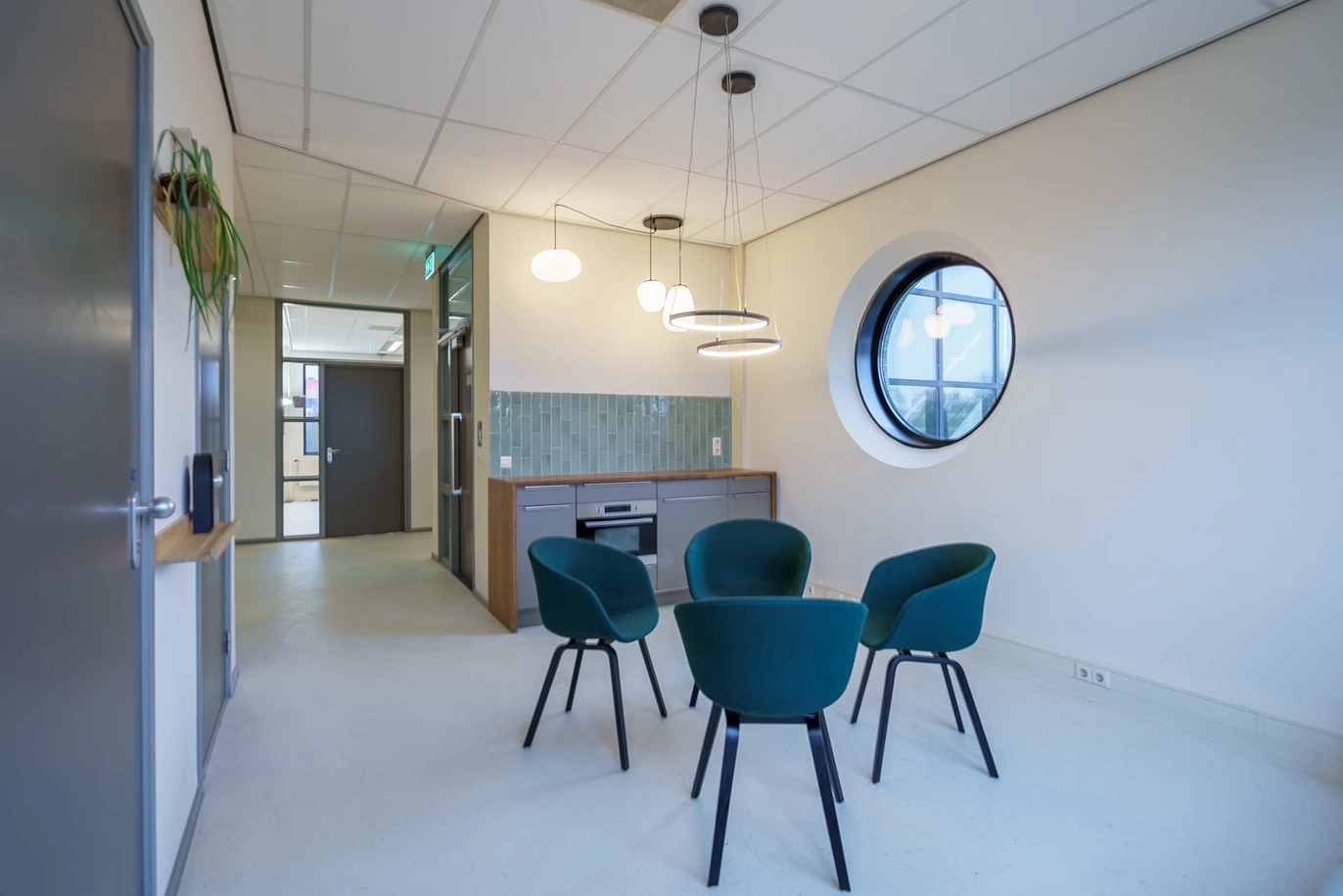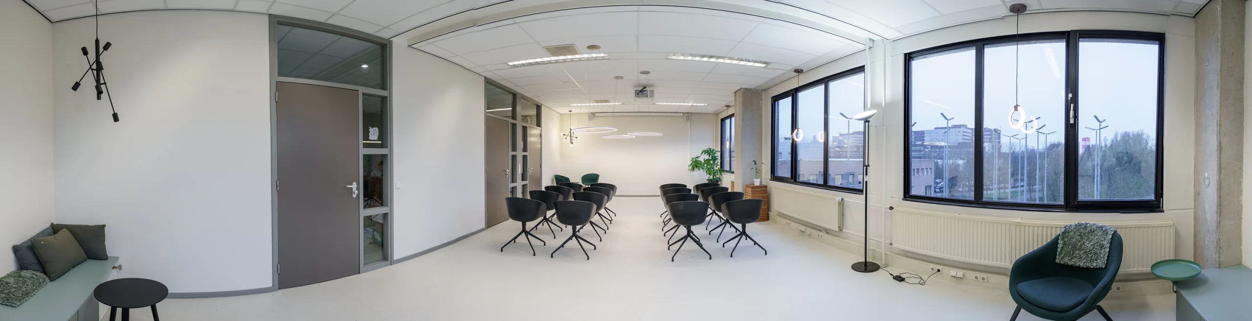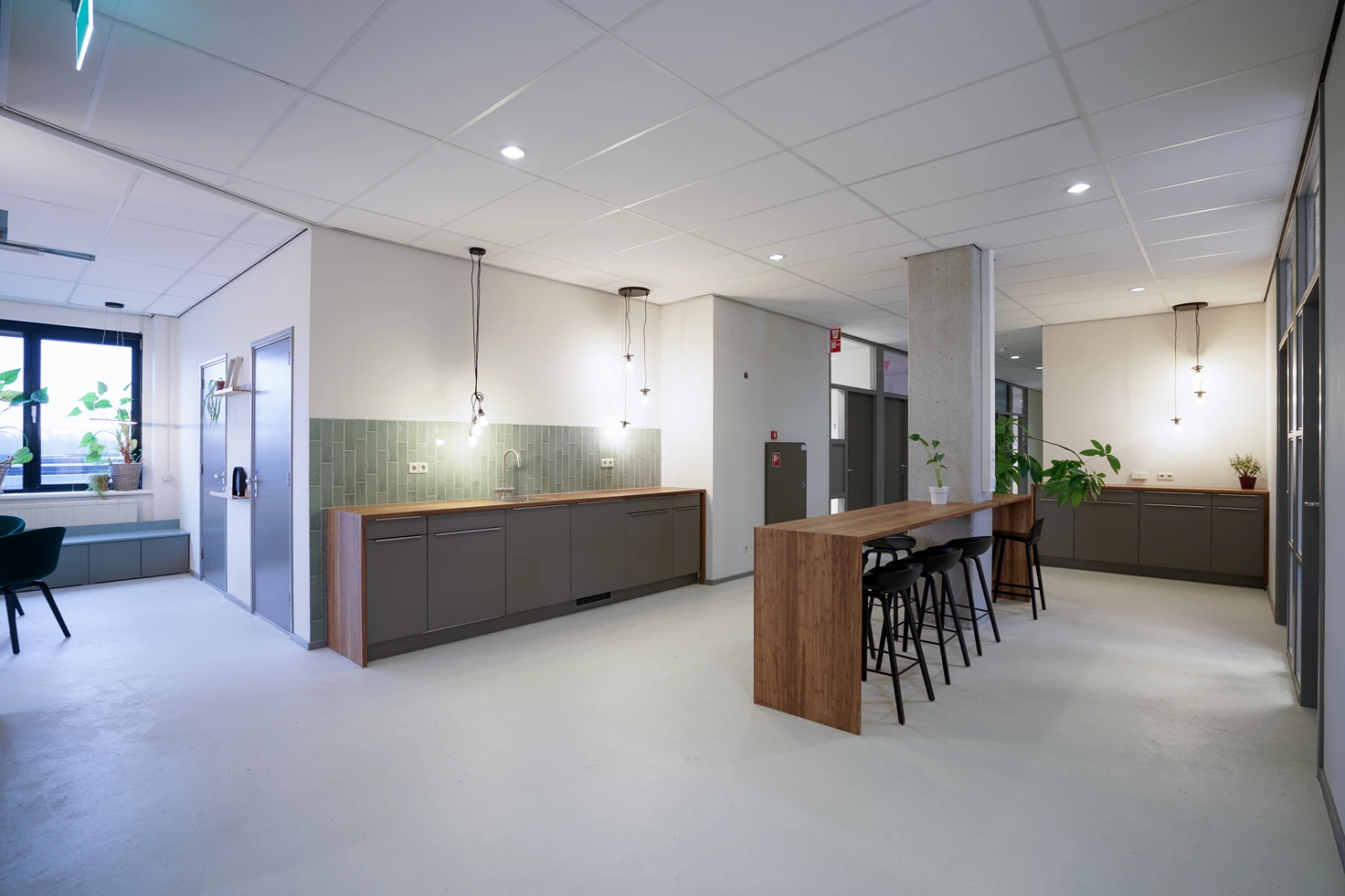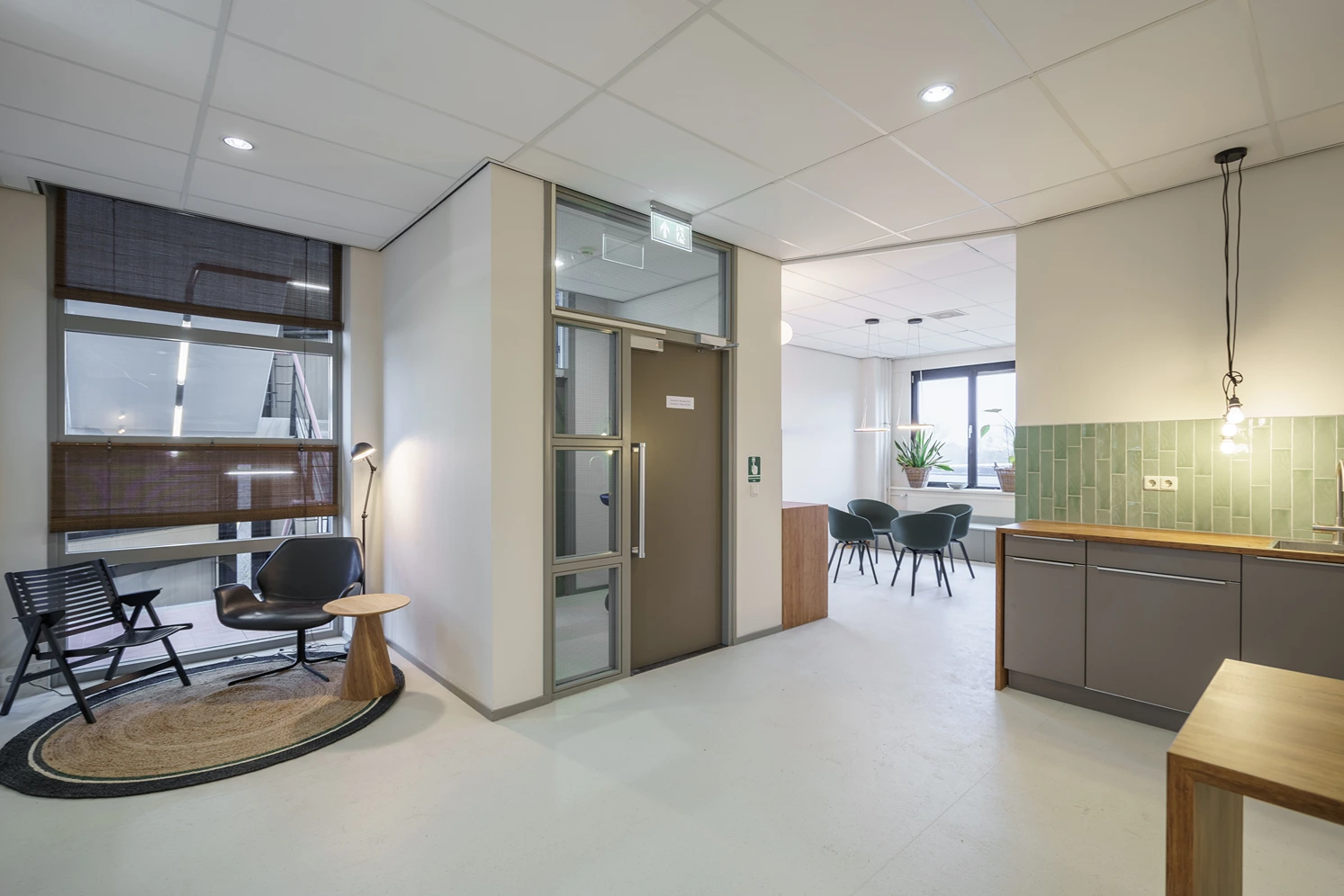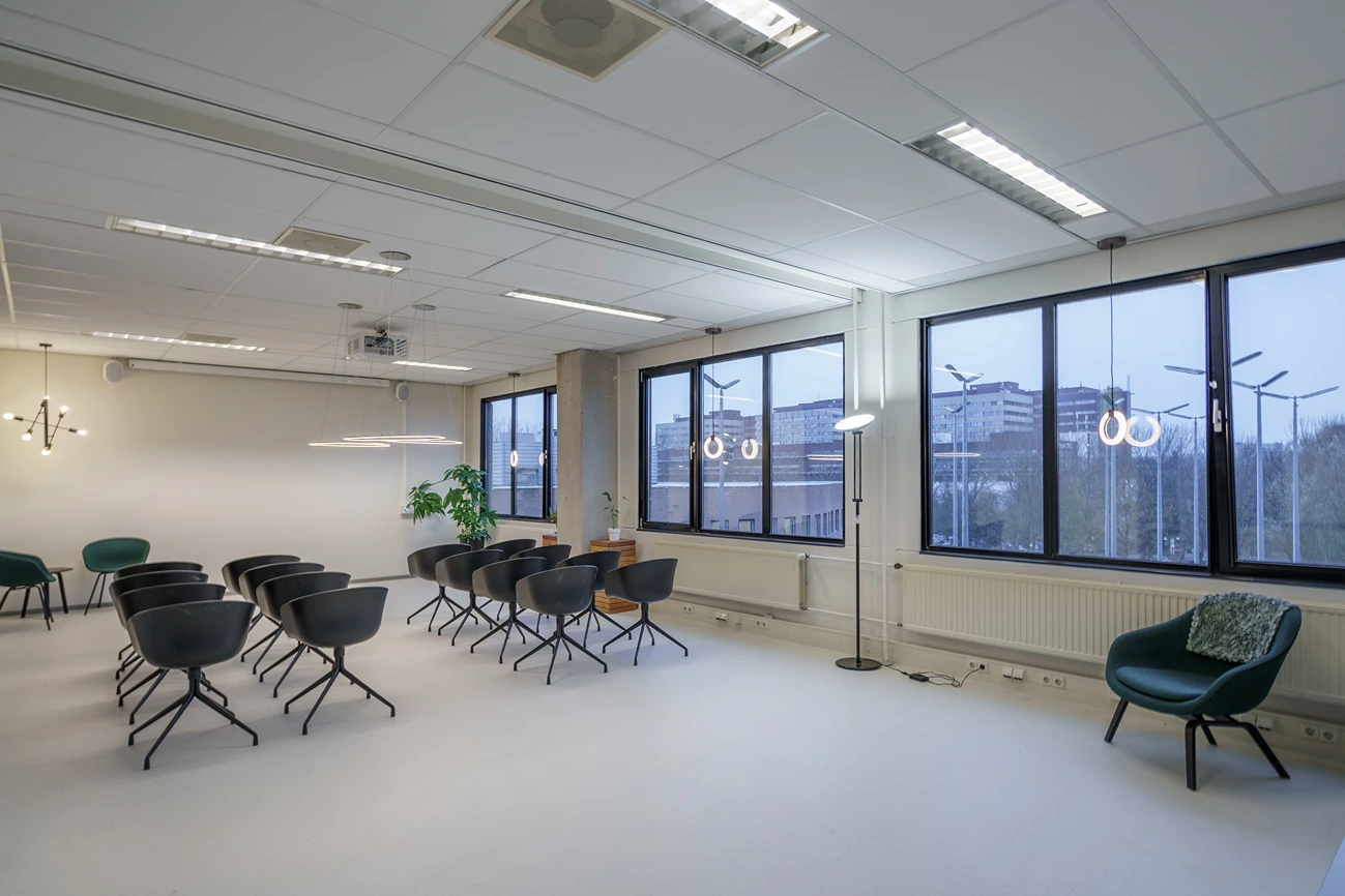 • Afwerking: Hoogwaardige materialen, akoestische plafonds en duurzame vloerbedekking geven het kantoor een frisse uitstraling.
