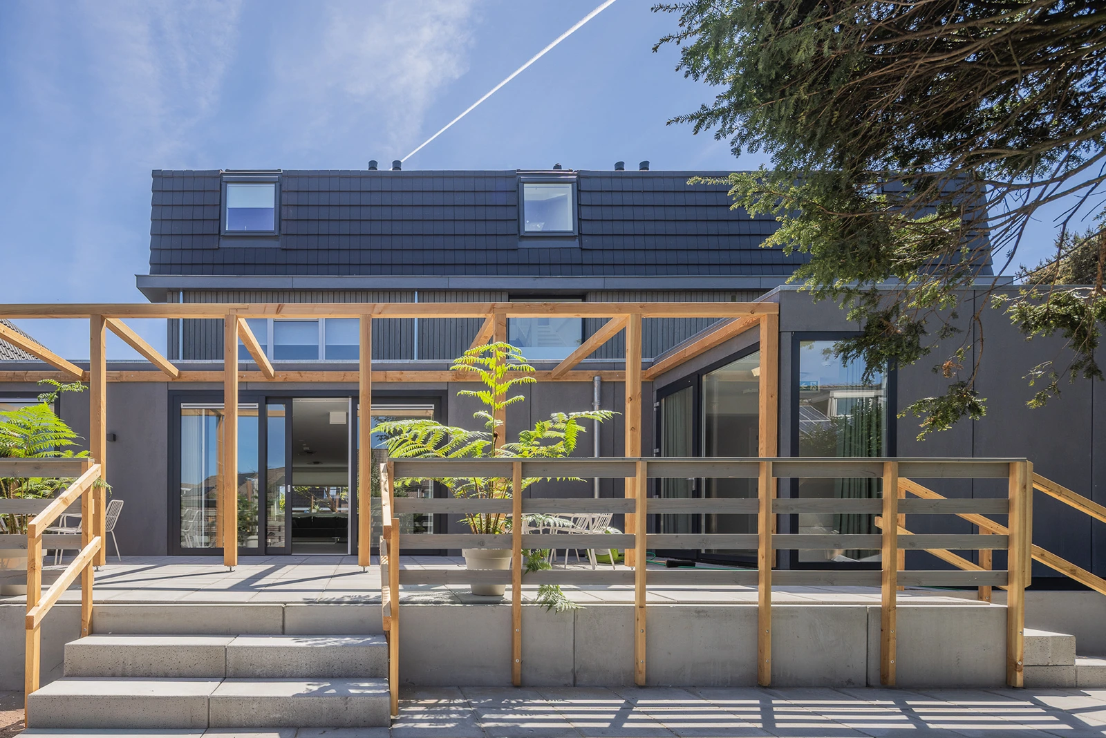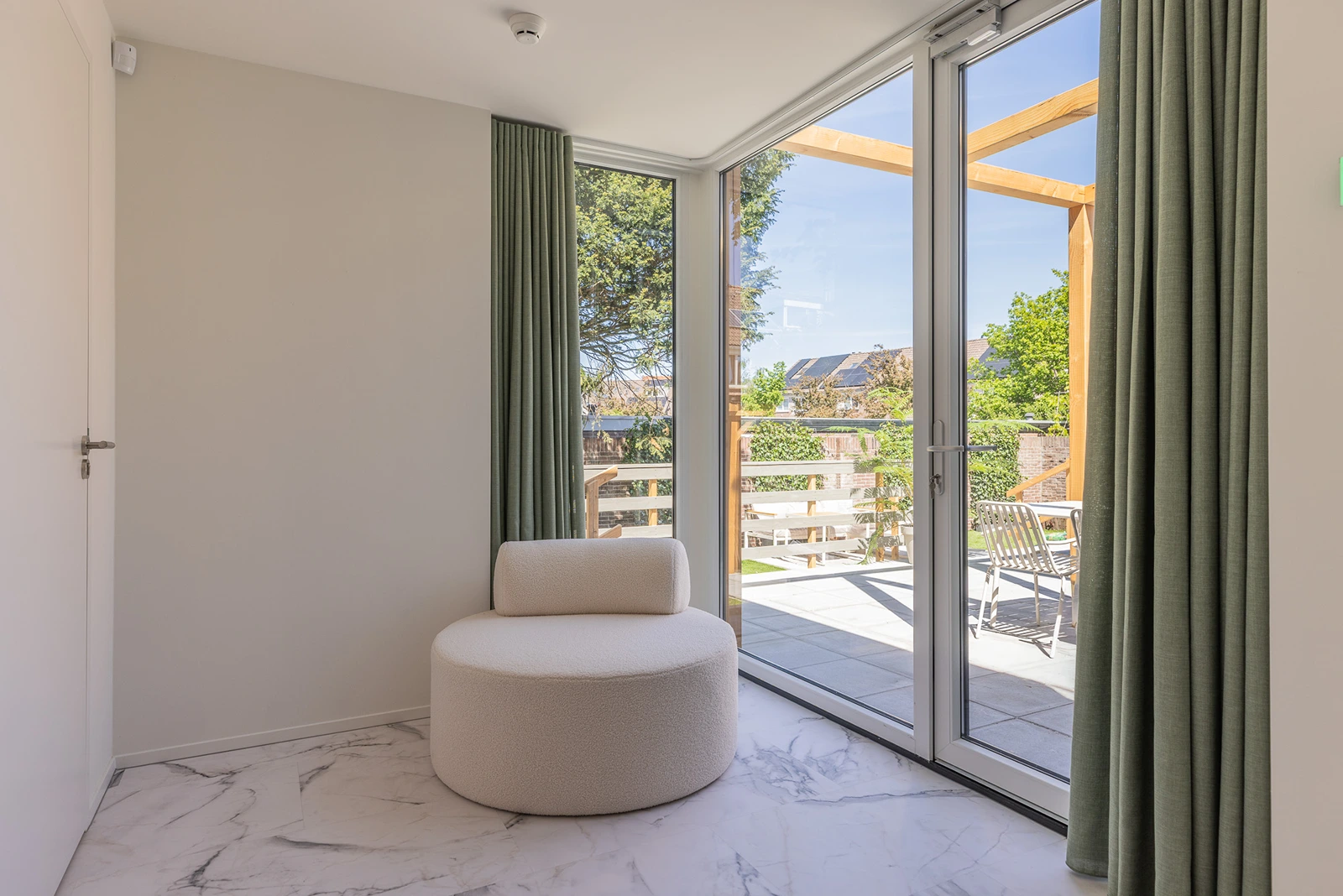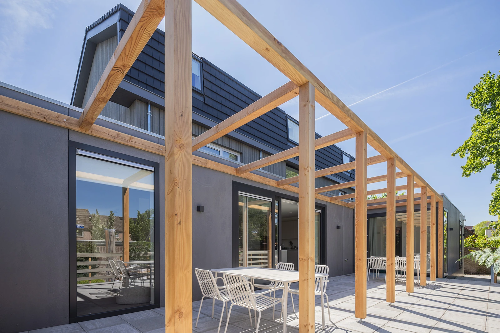 Een belangrijk onderdeel van deze verbouwing is de verduurzaming en ingrepen om het woon/leef oppervlakte te vergroten via de kapvorm en uitbouw. Door de plaatsing van een volledig nieuwe kapvorm en schil (dak) met hoogwaardige isolatie, vloerisolatie en vloerverwarming door het hele gebouw, is het energielabel verbeterd van D naar A+. Hiermee voldoet de zorgwoning aan de hedendaagse eisen van energiezuinig en comfortabel wonen.